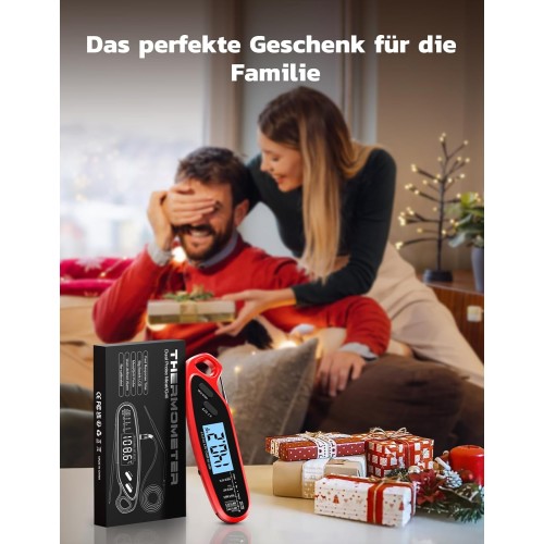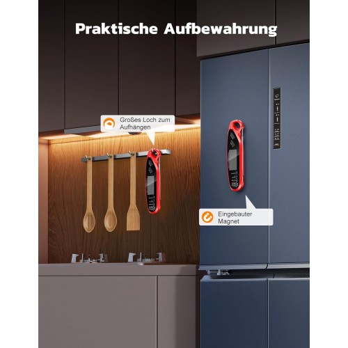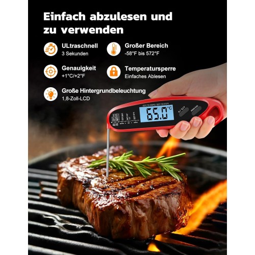 • Sofort ablesbar und leicht zu sehen: Das sofort ablesbare küchenthermometer liefert schnelle Messwerte in nur 3 Sekunden. Mit der Hold-Taste kann die Temperatur gesperrt werden. Das große 1,8-Zoll-Display mit Hintergrundbeleuchtung ermöglicht eine einfache Ablesbarkeit bei jedem Licht und an jedem Ort
