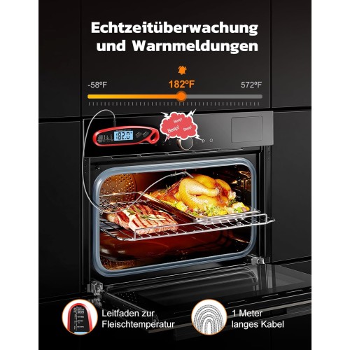 • Zwei sichere Sonden für vielseitigen Einsatz: Unsere thermometer kochen bietet eine eingebaute drehbare Sonde und eine weitere externe Langdrahtsonde. Die eingebaute 4,6-Zoll-Sonde eignet sich hervorragend zum Braten von Fleisch, Flüssigkeiten, Öl, Backen und zur Herstellung von Süßigkeiten in der Küche oder im Freien, und die 1-Meter-Drahtsonde ist ideal zur Überwachung von Heißluftfritteusen, Öfen, und Grills (auch in geschlossenem Zustand). Halten Sie Ihre Hände frei und von gefährlicher Hitze fern