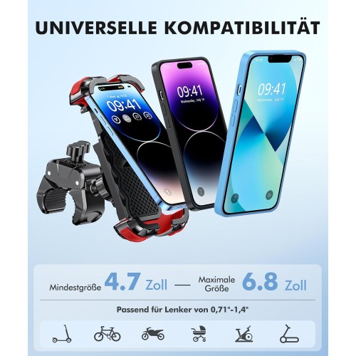 • Universelle Kompatibilität: Diese universelle rennrad handyhalterung bietet Platz für Mobiltelefone mit einer Größe von 4,7 bis 6,8 Zoll und einer Dicke von bis zu 15mm (einschließlich Handyhüllen). Weitgehend kompatibel mit Geräten wie dem iPhone 16 Plus/16 Pro/16/15 Pro Max/15 Plus/15 Pro/15/14 Pro Max/14 Pro/14 Plus/14/13 Pro Max/13 Pro/13/13 Mini/12 Pro Max/12/12 Mini/SE, Galaxy S24+/S24/S23 Ultra/S23+/S23/S22 Ultra (Bitte beachten Sie: Nicht kompatibel mit Galaxy S24 Ultra)