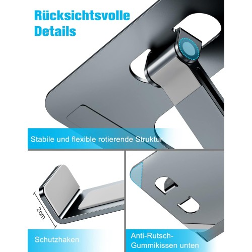 • 【Stabil & Robust】Der Laptop-ständer besteht aus einer hochwertigen Aluminiumlegierung. Es kann bis zu 8,8 lbs (4 kg) tragen, ohne das Panel zu schütteln. Das Panel und seine zwei Haken sind mit rutschfesten Riemen ausgestattet, um die Laptop Holder stabiler zu machen, und 4 rutschfeste Silikonpads an der Unterseite verhindern ein Verrutschen des Computer-Risers. Diese rücksichtsvollen Designs sollen Ihnen eine bessere Nutzung gewährleisten.