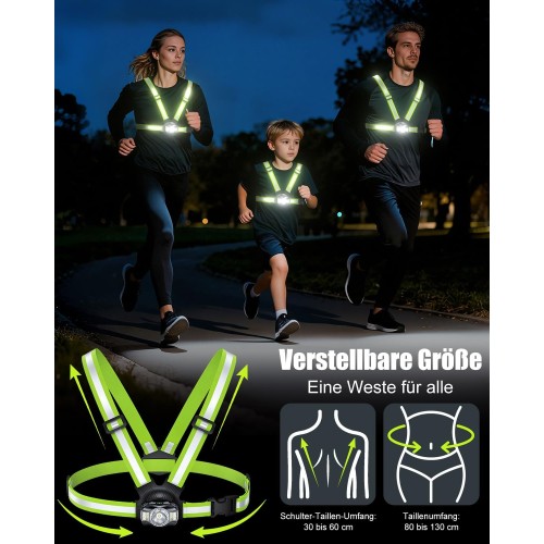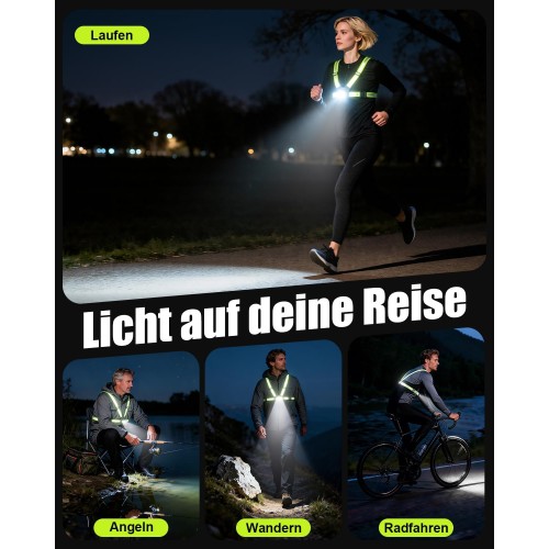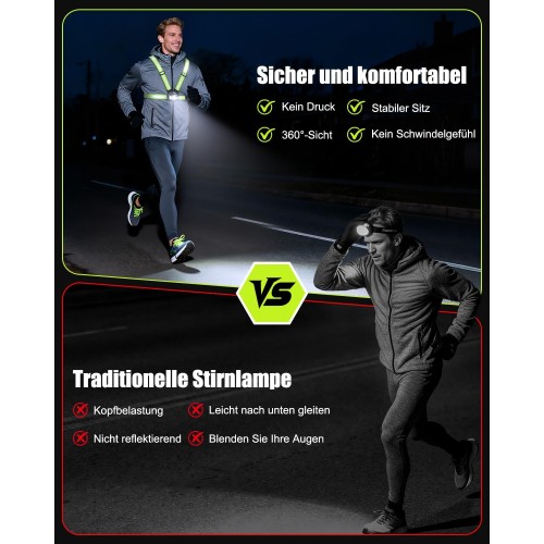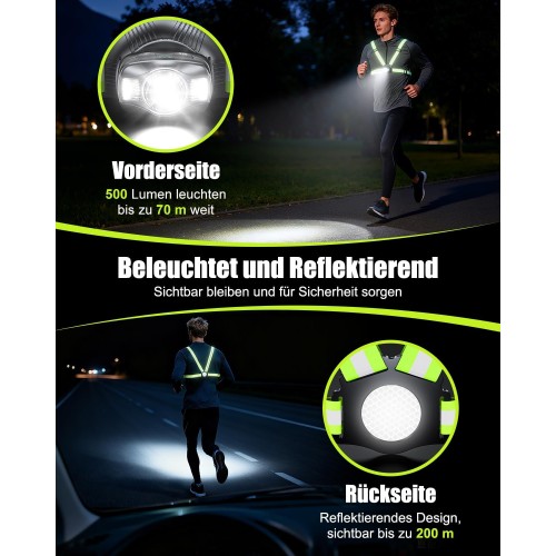 • [Ultrahell & 360°-Sichtbarkeit] Ausgestattet mit einer 500 Lumen starken Front-LED leuchten unsere brustlampe zum joggen Wege bis zu 70 Meter weit aus und sorgen für sichere Nachtausflüge. Diese reflektierende Laufweste verfügt über eine extragroße Reflektorplatte auf der Rückseite (bis zu 200 Meter sichtbar) und Reflektorstreifen an den Schultergurten. So sind Sie aus allen Blickwinkeln gut sichtbar – tote Winkel werden vermieden und Sie sind beim Laufen, Joggen oder Gehen geschützt