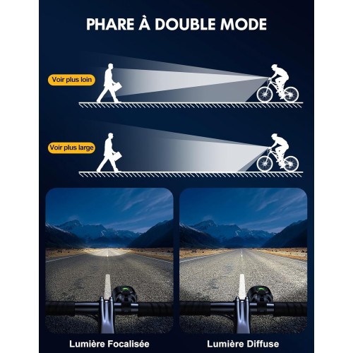 • [8+7 Modes - pour Différentes Conditions de Conduite] Avec 8 modes de lumiere velo avant et 7 modes pour le feu arriere velo, nos feux velo répondent à divers besoins de conduite et s'adaptent à différentes conditions de cyclisme. Ils garantissent que vous puissiez voir et être vu pendant que vous roulez, offrant une protection à 360 degrés. De plus, la fonction de mémoire des modes permet une utilisation future pratique.