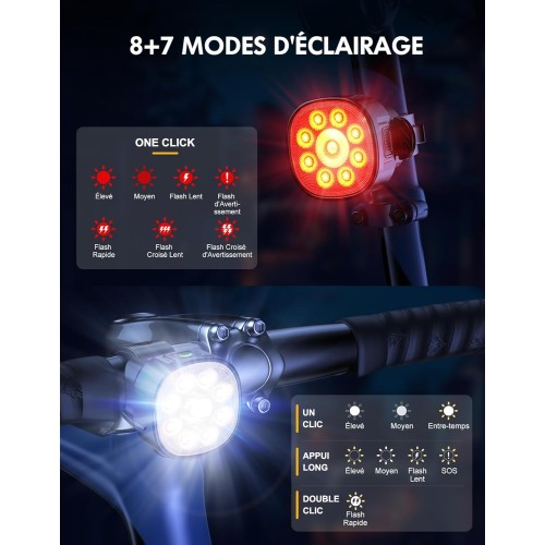 • [8+7 Modes - pour Différentes Conditions de Conduite] Avec 8 modes de lumiere velo avant et 7 modes pour le feu arriere velo, nos feux velo répondent à divers besoins de conduite et s'adaptent à différentes conditions de cyclisme. Ils garantissent que vous puissiez voir et être vu pendant que vous roulez, offrant une protection à 360 degrés. De plus, la fonction de mémoire des modes permet une utilisation future pratique.