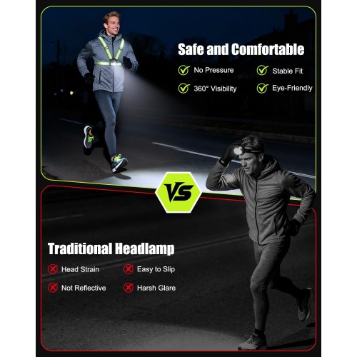 • [Ultra Bright & 360° High Visibility] Equipped with a 500 lumen front LED, our running light illuminates paths up to 70 meters ahead, cutting through darkness for safe night outings. This reflective running gear features an extra-large rear reflective board (visible up to 200 meters) and reflective strips on shoulder straps, ensuring you’re seen from all angles—eliminating blind spots and keeping you protected whether running, jogging, or walking.